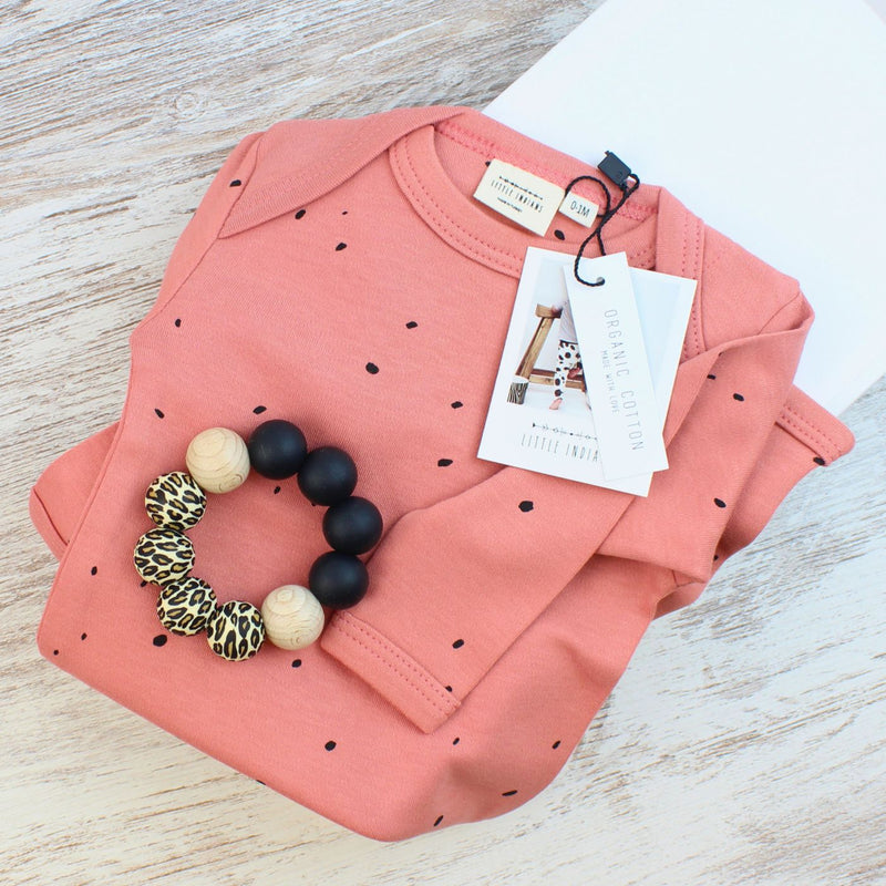 Produzido com silicone reforçado e contas de madeira de faia orgânica não tratada, ajuda a aliviar o desconforto da dentição e a massajar suavemente as gengivas.