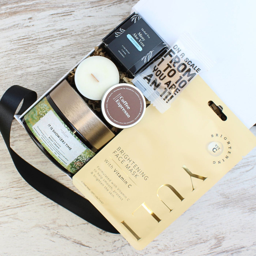 O creme de corpo extra nutritivo tem manteiga de karité, óleo de amêndoas doces, vitamina E, óleo de argão e aroma de almíscar de tangerina que vão deixar a pele super sedosa (com a mensagem "It´s Show(er) Time"). A acompanhar, um delicioso chá de menta e aloé vera, uma máscara iluminadora para rosto com vitamina C, uma aromática vela de café e uma bolacha com mensagem.