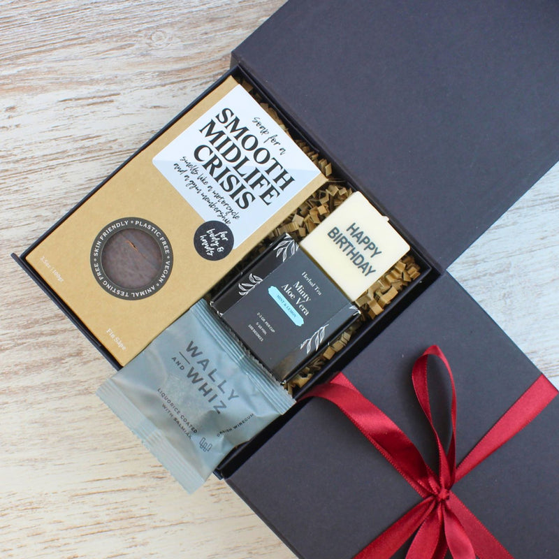 Tudo é cuidadosamente acondicionado numa caixa prenda com fecho magnético, decorada com fita, e inclui um postal personalizável para a tua mensagem especial.