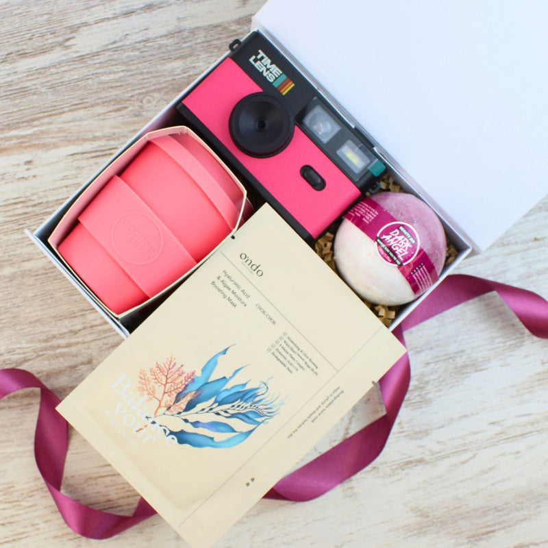Tudo é cuidadosamente acondicionado numa caixa prenda com fecho magnético, decorada com fita, e inclui um postal personalizável para a tua mensagem especial.