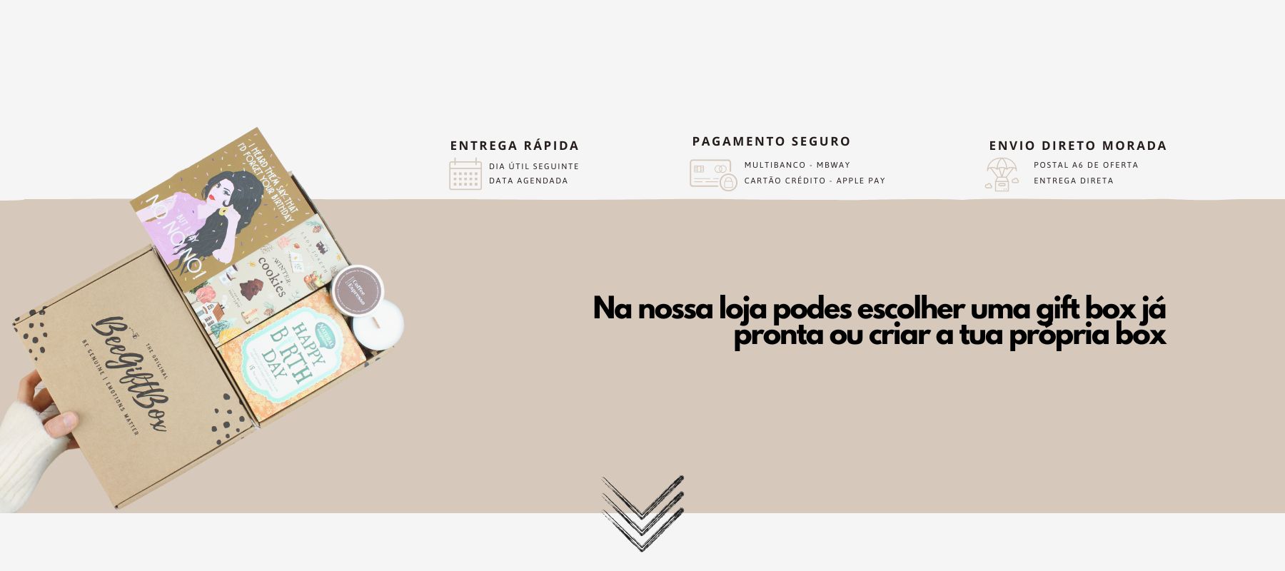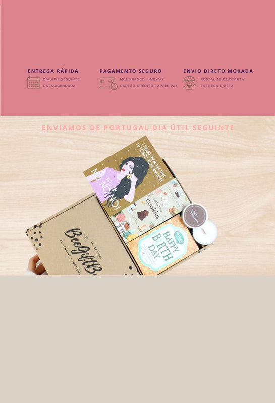 Escolhe uma caixa de envio ou caixa presente, adiciona ao carrinho, depois vai adicionando os produtos que desejas. Nós adaptamos o tamanho da caixa consoante os produtos que escolheste. Depois é só colocares a mensagem para o postal A6 de oferta.